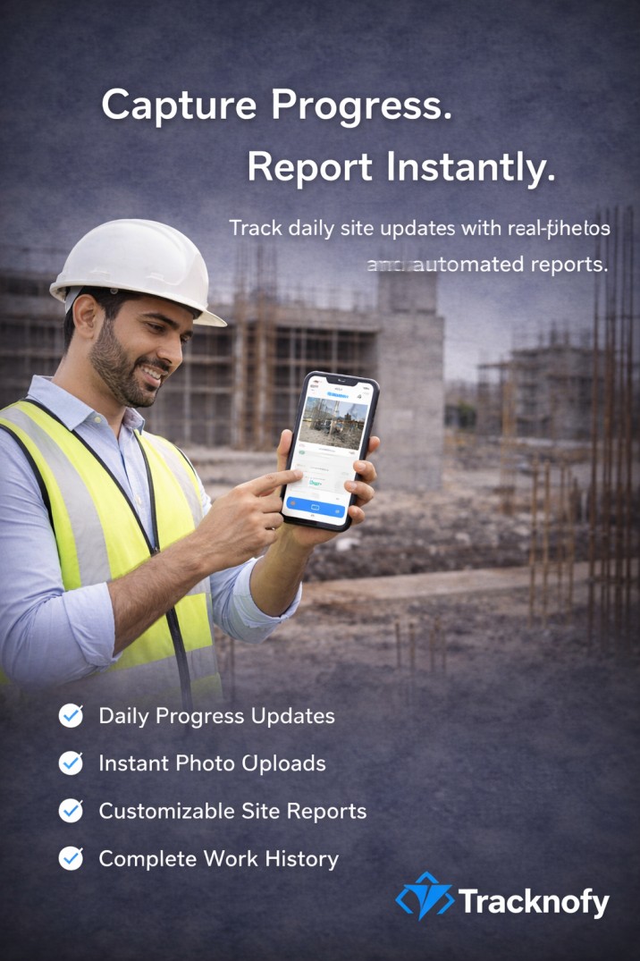 Site supervisors simply capture photos, add notes, and submit daily updates through the Tracknofy mobile app. Every update is automatically time-stamped, location-verified, and synced to the office — creating a true, visual record of site progress.